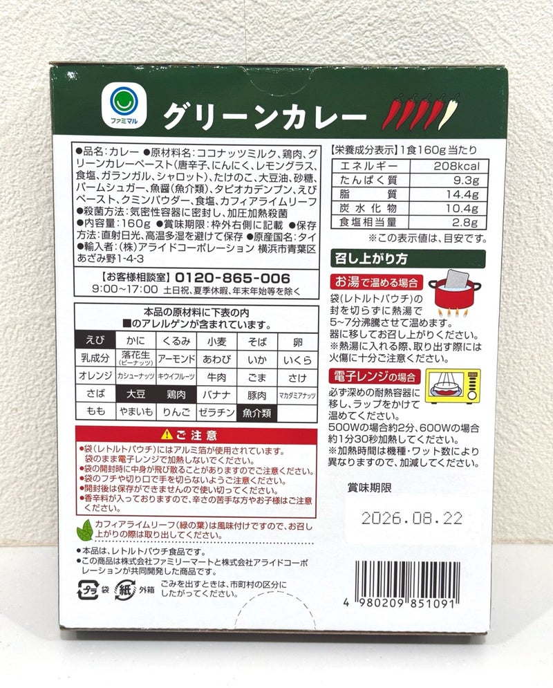 さて、そんな私ですが近所のファミマでグリーンカレーを見つけたので買ってみました。(レトルト)